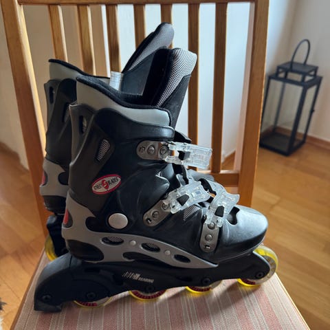 Diverse rulleskøyter størrelse 39-40 og justerbar 36.5-40.5 Laget med justerbar ramme og hjul designet for utendørs bruk. Materialet er en kombinasjon av plast og tekstil for støtte og komfort.