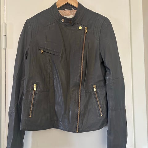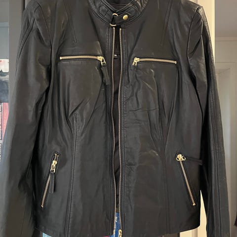 Flott svart skinnjakke i str: 38. Som ny. Knapt brukt. Kan hentes i Oslo eller sendes. Kjøper betaler porto.