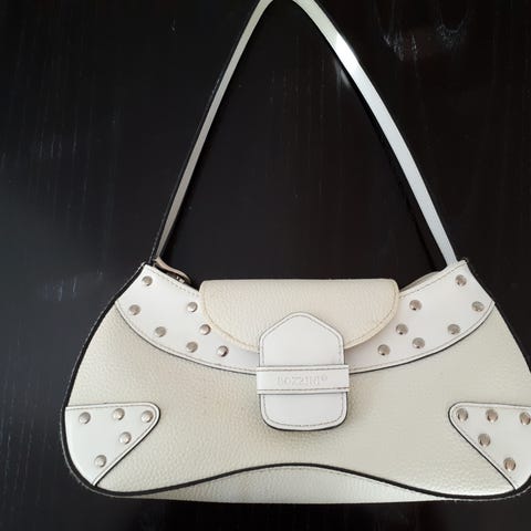 Lekker skinnveske i beige med gulldetaljer. Mål B32xH23 cm. To små lommer innvendig og en lomme utvendig med glidelås. Skulderreim følger med. Kan sende med Postnord til 69,-.
