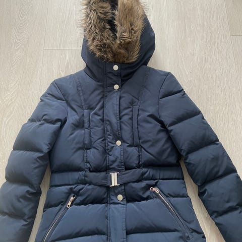 Zara barn jakke, ullblanding i mørk blå farge, størrelse 164. Jakken har hette med fuskpels og lukkes med glidelås og knappelukking. Jakken er lett A formet, pent brukt - ingen synlige bruksmerker.