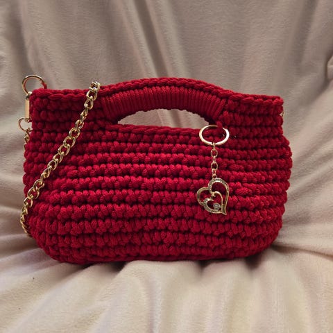Selger selvheklet veske i fargen perlemor. 17×23 cm. Heklet i 3mm poliester tråd. Med bunn og glidelås.