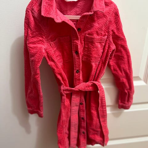 Ubrukt kjole, lyserosa med små blomster og blader i hvitt, lyseblått, oransje og grønt. Knepping foran. Rysjet hals. Strikk nederst på ermene.