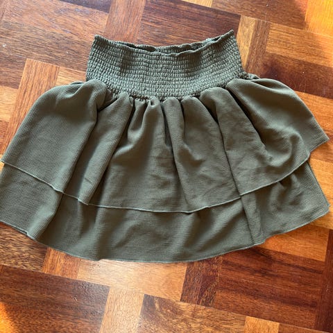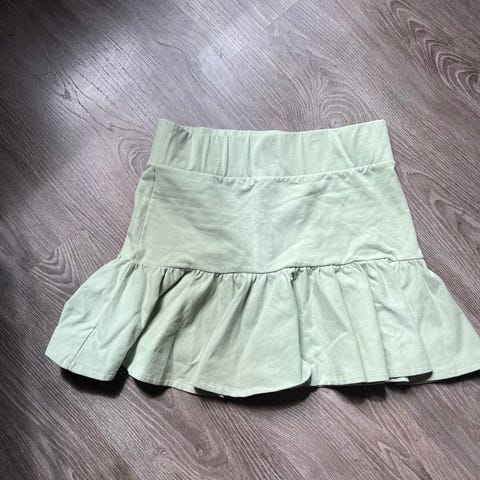 Noisy May S Grønn kordfløyelskjørt for kvinner. Skjørtet er i størrelse S og har en grønn farge. Materialet er kordfløyel, og har en dekorativ volang. Det er litt stort i størrelsen☺️ Det er bare brukt noen få ganger, og er like godt som nytt