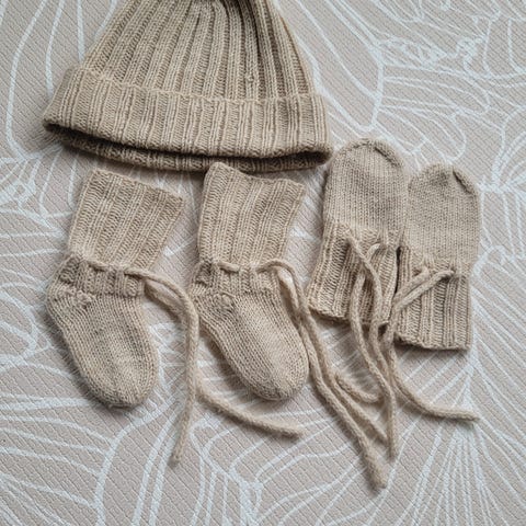 100% Ullsokker og ull lue for de minste ca( fra 0 - 4mnd) Veldig behagelig å ha på. Ikke brukt.