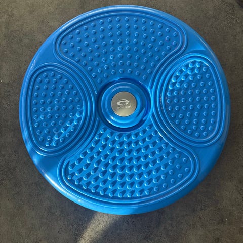 Abilica Soft Balance balansetrener i blå farge. Produktet brukes til balanse- og treningsøvelser, pumpe som en gang fulgte med, er forsvunnet. .
