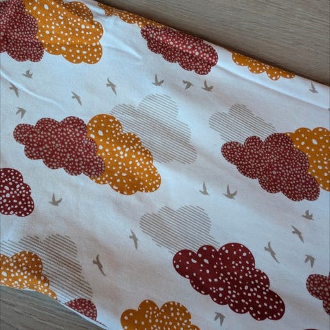 Jersey med retro blomstermotiv, full bredde. Vasket på 40 grader, så ferdig krympet.