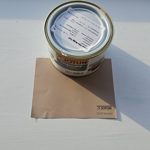 Gir bort en åpnet (men kun tatt noen dråper) boks med maling. Fargeprøve eksteriør Jotun. Farge Dewy green. Kjøpt våren 2025. Ikke vært utsatt for frost.