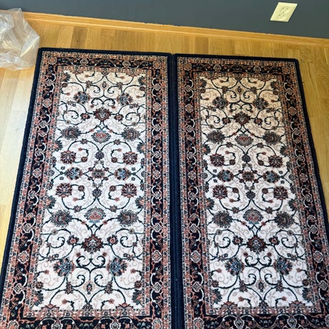 Selger to stykk like tepper i silke, håndvevd, pris 900kr pr stk.