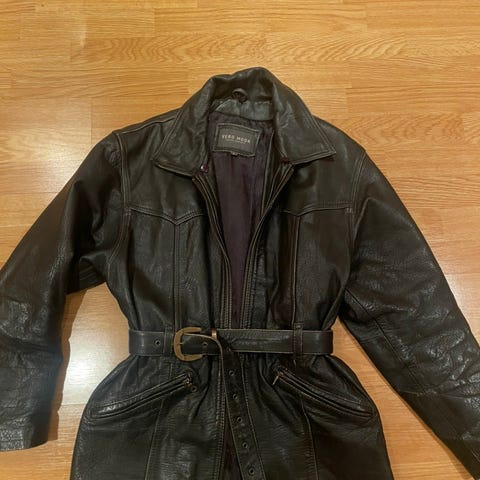 Purchased in a wonderful preloved shop in Hampstead Heath, London. Jacket is soft leather oversized fit. It has a very tiny mark on the back, please see all pictures. I would say this jacket is in fabulous preloved condition