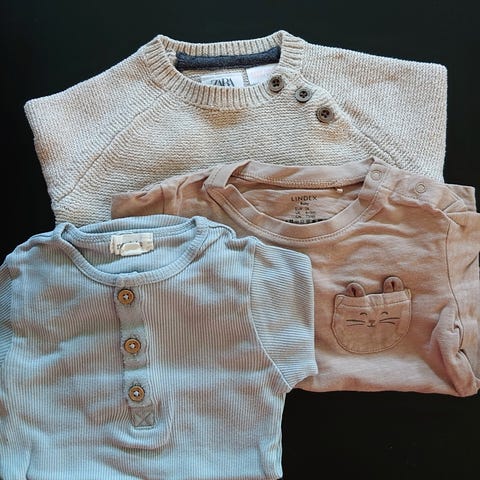 Selger unna klær etter gutten vår. I hovedsak størrelse 74, men størrelse 80 og 86 kan forekomme. Det kan forekomme hull og flekker, men har forsøkt å sortere det vekk.