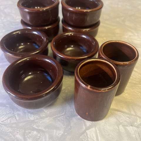 Vintage saltkar fra Egersund fajanse med blå/lilla dekor og teaklokk
