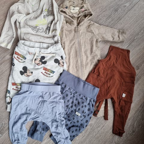 Newbie barneklær sett i størrelse 80 for gutt, flerfarget. Settet inkluderer en hettejakke med bamseapplikasjon, en grå overall med seler og en beige body med knapper foran.