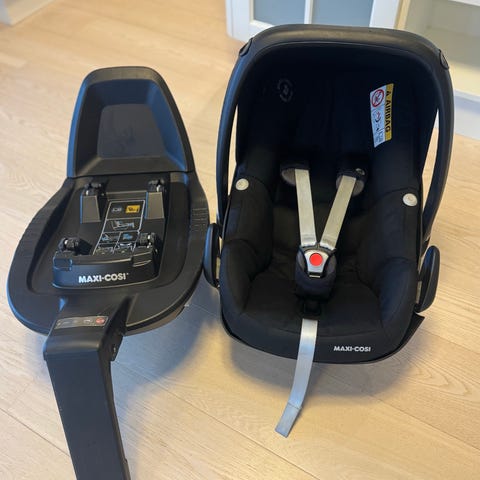Pent brukt babysete til baby med base. Basen passer til flere seter fra Maxi Cosi, f.eks. Pearl. Setet er litt slitt på utsiden, der man setter seter ned i basen, men det syns ikke og har ingen betydning. Seter er ellers i fin stand. Basen ser så og si ut som ny. Et lite hull i «solskjermingen» som nesten ikke syns og har ingen betydning.