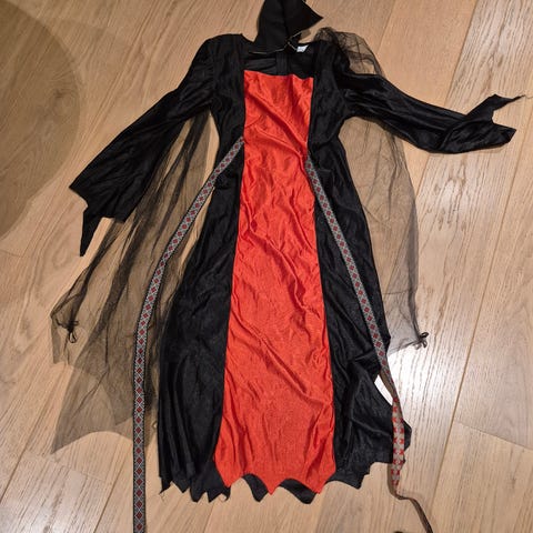 Datter selger vampyrkostyme jente str 140. Består av vampyrkjole med fine detaljer som krage etc. og halsbånd. Som alle kostymer så synes jeg denne er litt liten i str, så kan nok passe fra ca 8 år og oppover.