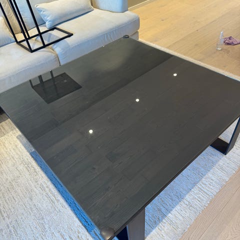 Nydelig salongbord med bein i hel eik og 20mm glassplate.