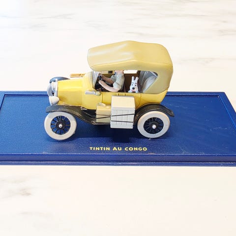Keramikk bilformet skål i hvit farge med gullfargede detaljer. Skålen er utformet som en klassisk sportsbil montert på en rektangulær base. Rundt på basen og bilen finnes flere trykte bilmerkelogoer. Gjenstanden kan brukes som pyntegjenstand, oppbevaringsskål eller borddekorasjon. Laget i keramikk med glatt glasert overflate.kjøpt i USA for mange år siden, den er gammel, og ble produsert når singer lagde biler, og ikke symaskin