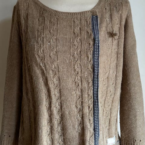 Odd Molly #336 strikket beige cardigan i størrelse 2/M. Strikkejakken har knapper foran, lommer, en liten sløyfedetalj på brystet og logo patch bak. 25% alpakka, 30% ull og 45% akryl. Pent og svært lite brukt.