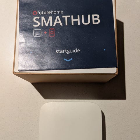 Futurehome Smarthus Hub med 5V DC, 2,5A strømtilførsel. Enheten er designet i Norge. Den har tilkoblinger for strøm, USB og Ethernet. Fargen er hvit.