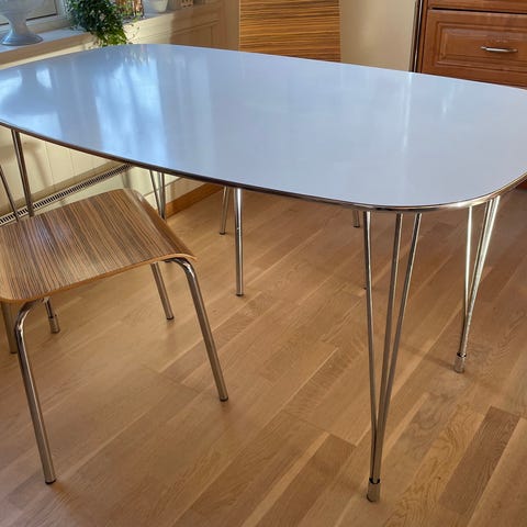 Pent brukt rundt kjøkkenbord som er 4 år gammelt og kjøpt nytt på Jysk des-21. Det ene benet har en liten svakhet, men som ikke er av betydning til normalt bruk. Bordet er stabilt. Vi har festet det ene bord benet ekstra godt med skruer.