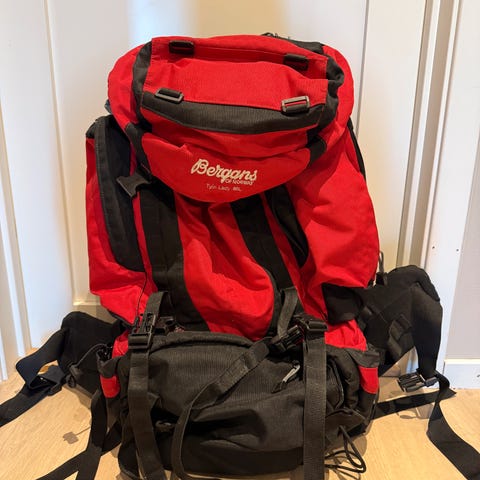 Bergans Tytin 65 L Lady ryggsekk i mørk lilla farge. Sekken har en kapasitet på 65 liter og er designet spesielt for kvinner. Den har flere lommer og justerbare stropper for tilpasning og komfort under bruk. Brukt på et par hytteturer.