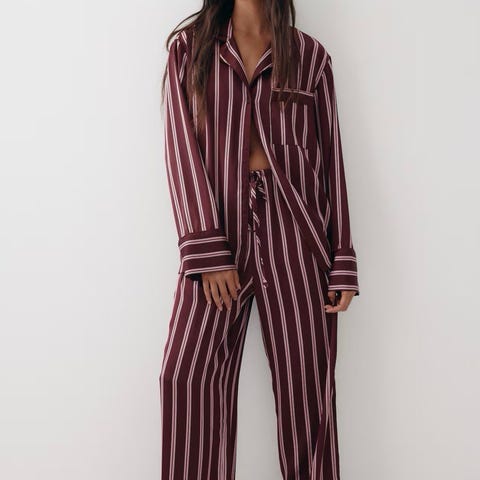 Ønsker å kjøpe denne rutete flanell pyjamasen / pysj med flanell skjorte (str. M) og flanell bukse (str. L) Fra Gina Tricot i bomullviskose, farge burgunder og hvit.