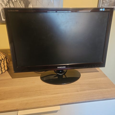 Samsung 24-tommers skjerm med DVI og VGA tilkoblinger. Skjermen har en svart plastramme og rund fot. Egnet for bruk med datamaskiner som krever disse tilkoblingstypene.