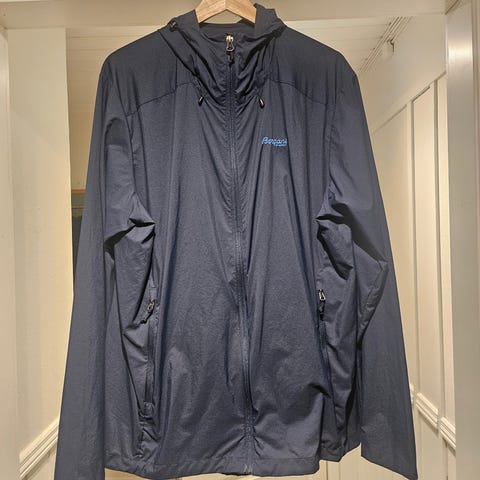 Ny jakke, fortsatt med tag, kun prøvd i butikk. Farge «smolder blue». Strl. M. De hadde ikke large, og jeg tenkte at det går sikkert bra, jeg er snart medium igjen. Det viste seg å være fri fantasi.