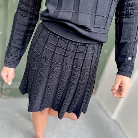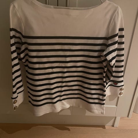 Rett passform med en liten splitt i sidene. Fin detalj med fiskebensmønster rundt halsen, puffermer med to Busnel-knapper nederst, Str S, helt normal i størrelsen. Kjøpt ny fra butikk, lapper sitter fortsatt på. Ekstra knapp følger også med.