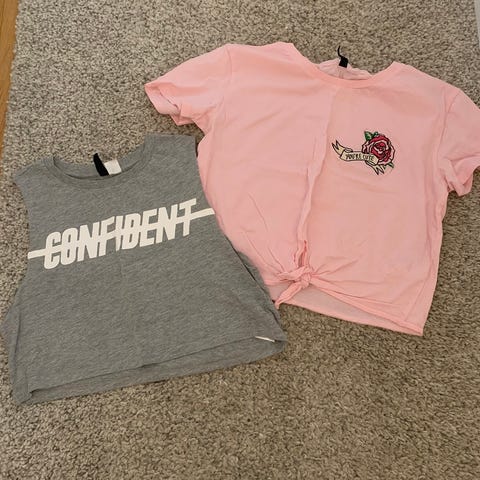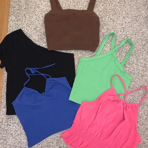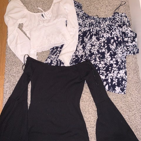 De fleste toppene er fra New Yorker, men den lengste mørkegrå toppen er fra hm, og den lyseblå med frynser på skuldrene er fra Zara. Størrelsene på toppene varierer fra xs-m, man kan man se størrelsene på bilde 3 & 4. De som er i str M, både de fra New Yorker og den fra Zara er noe små i størrelsen da de er nokså korte, og vil si alle passer en xs-s.