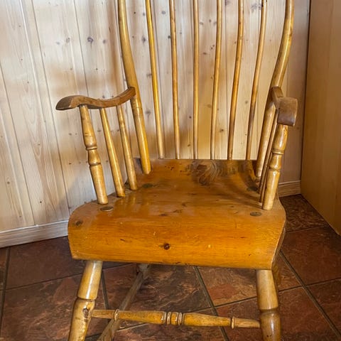 Den har solide dreide bein, buet rygg og utsvingte armlener - et ekte blikkfang i både moderne og tradisjonelle hjem.