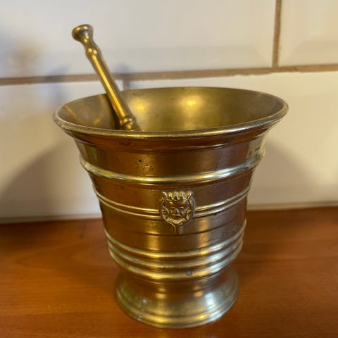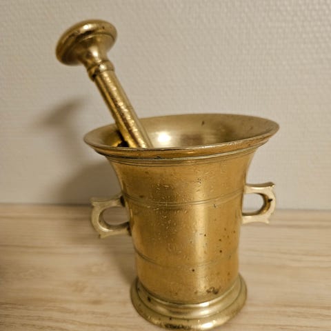 Mortel veier 652 gram, 10 cm høy, 10,5 cm diameter. Stemplet L.Hansen 5.
