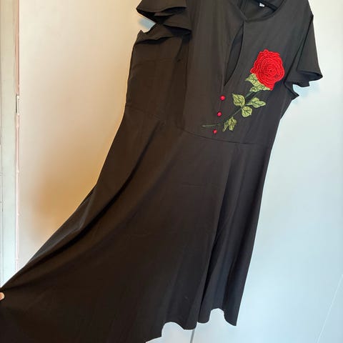 Kjolen har kort erm, markert midje og et utsvingt skjørt som gir nydelig bevegelse og vintage-inspirert eleganse.