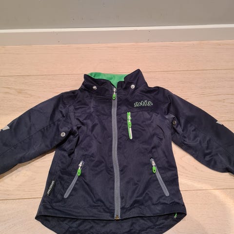 Jakken har avtagbar hette med pelskant og refleksdetaljer. Den har fleecefôr i rygg/mage. Glatt stoff i ermene.