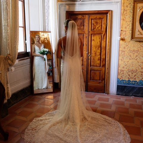 Du kan lese mer om kjolen her: https://www.nicolemilano.com/wedding-dress-flowy-a-line-v-neck-cap-sleeves-elestren