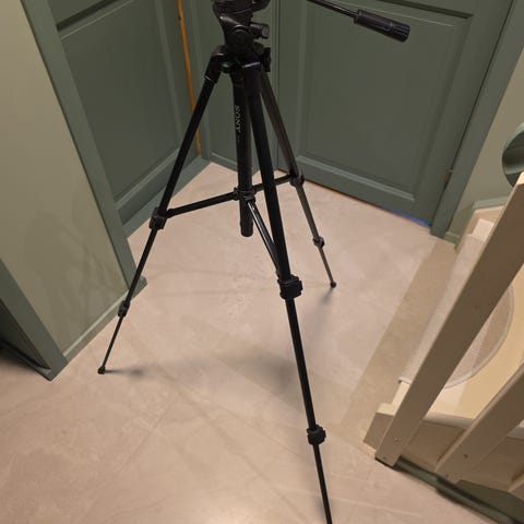 Sony kamerastativ med justerbare ben, integrert fjernkontroll for kamerastyring, og medfølgende bæreveske. Stativet har en solid konstruksjon i metall og plast, samt en trådløs fjernkontroll med knapper for opptak og zoom. Egnet for bruk med ulike Sony-kameraer og andre kompatible enheter.