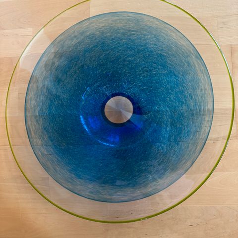 Steninge Slott dekorativ fat laget av blått kunstglass med unikt, bølgende design i midten.