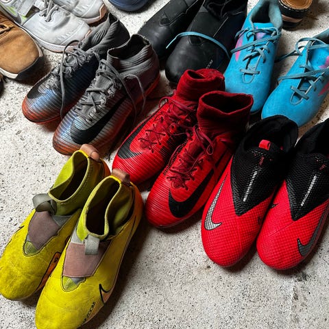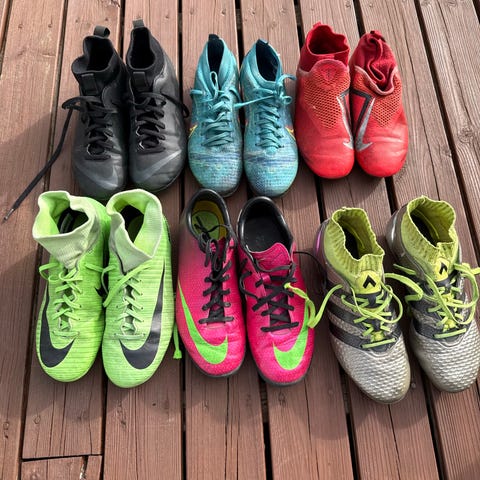 Fotballsko i størrelsene 34 og 35.5. Skoene har ulike farger og materialet er tilpasset for fotballbruk med gummisåler for godt grep på ulike underlag. Skoene er lite brukt av et barn. Pris er 150kr per par.