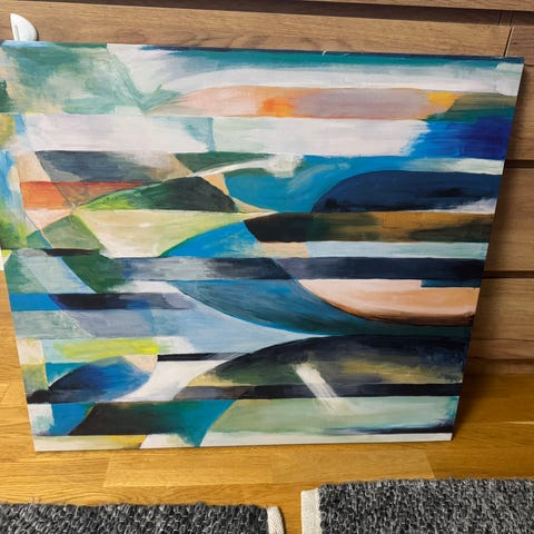 Flott og vårlig lerretsbilde i grønt og gult selges billig