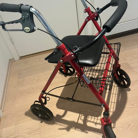 Solid og stødig rullator med fire hjul i rød farge, utstyrt med håndtak, bremsesystem, kurv foran for oppbevaring og sete for hvile. Designet for å gi støtte og stabilitet ved gange. Har blitt brukt som utendørs rullator.