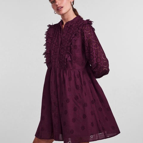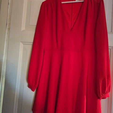 YAS kjole i størrelse L, farge rød. Kjolen har lange ermer med volangdetaljer og en løs passform. Underkjole og glidelås i siden. Ny pris kr.800,- Selges for halv pris kr.400,-