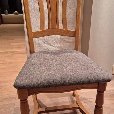 Pga plassmangel selger jeg 4 flotte eikestoler. Stolene som er svært solide (ingen "slark") er trukket med grønn velour.