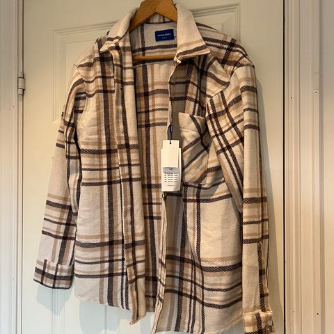H&M Jakke i størrelse M, farge svart. Jakken har knappelukking foran, krage og to brystlommer. Materialet ser ut til å være mykt og egnet for utendørs bruk. Ble litt stor for meg så må dessverre selge.