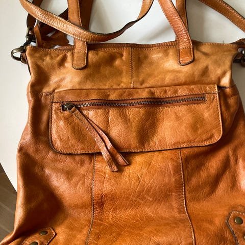 Dixie lærveske. bredde 35 cm og høyde 35 cm. laget av kvalitetslær. Vesken har praktisk glidelåslomme foran. Inni er det ett stort rom + 2 små stofflommer og 1 glidelåslomme. Vesken har både håndtak og justerbar, avtagbar skulderreim. Vesken er godt brukt, men tiden gir bare læret en vakker patina. Kan hentes i Oslo eller sendes. Kjøper betaler porto.