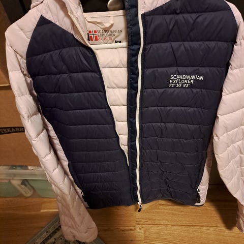 Bergans Down Long i XS, blå selges. Den er fylt med dun og er sertifisert i henhold til Responsible Down Standard (RDS). Den har hette og flere lommer, egnet for utendørs bruk og kaldere værforhold.