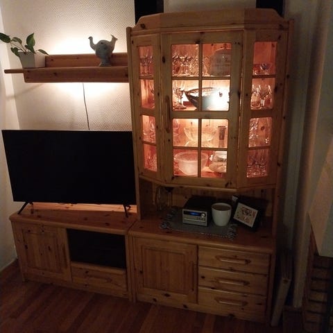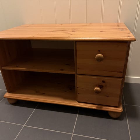 Seksjon/ TVbenk/ bokhylle i hel furu. Brukt på hytte. Snekret etter mål. 4 «etager». 2 rom nederst, 3 rom i de 2 midterste etager. Øverste hylleseksjon er bare 30 cm dybde. Ellers 50cm dybde.