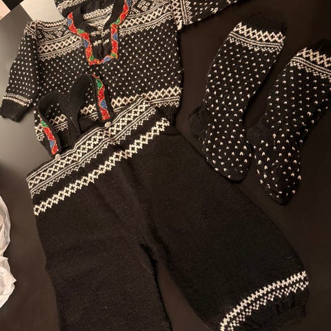 En flott hjemmestrikket vest til en festdrakt/fantadibunad. Strikket i ull. Barn/ungdom. 39 cm fra skulderen og ned. Vidde i livet er ca 90 cm. Sendes mot porto.