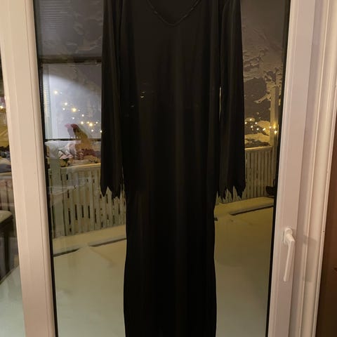 Kappekjole med hette, i fargene svart og rød. Kjolen har lange ermer og en belte- eller spennedetalj i livet. Materialet er ikke spesifisert, men kjolen har en glidende overgang mellom svart og rød farge. Str står ikke, men tenker 146.