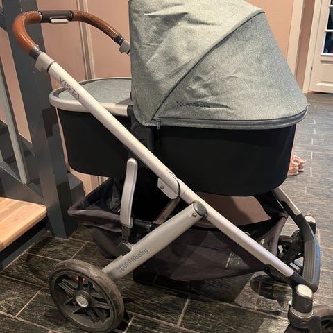 Pent brukt til ett barn, normale brukstegn men alt fungerer som det skal. Tekstiler rene, mekanikk solid og pålitelig.