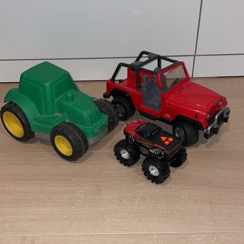Et fly fra Lynet McQueen (godt brukt) og en liten traktor og en liten lastebil.