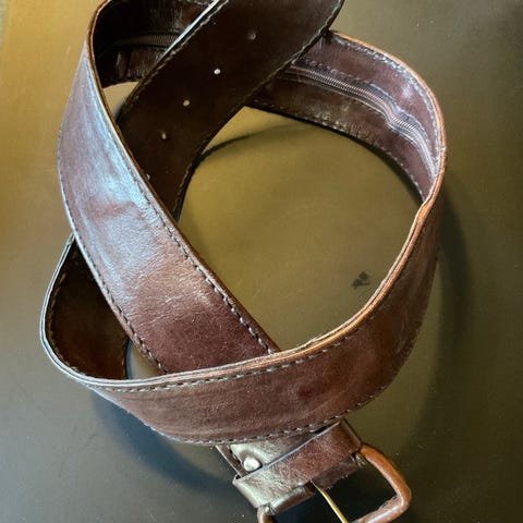 Tøft skinnbelte fra Henry Choice. Brunt skinn, bredde belte 4,3 cm, metallfarget spenne. Kraftig skinn. Størrelse 90 ( lengde totalt på læret 104 cm, lengde innerste hull 84,5, lengde ytterste hull 94 cm )